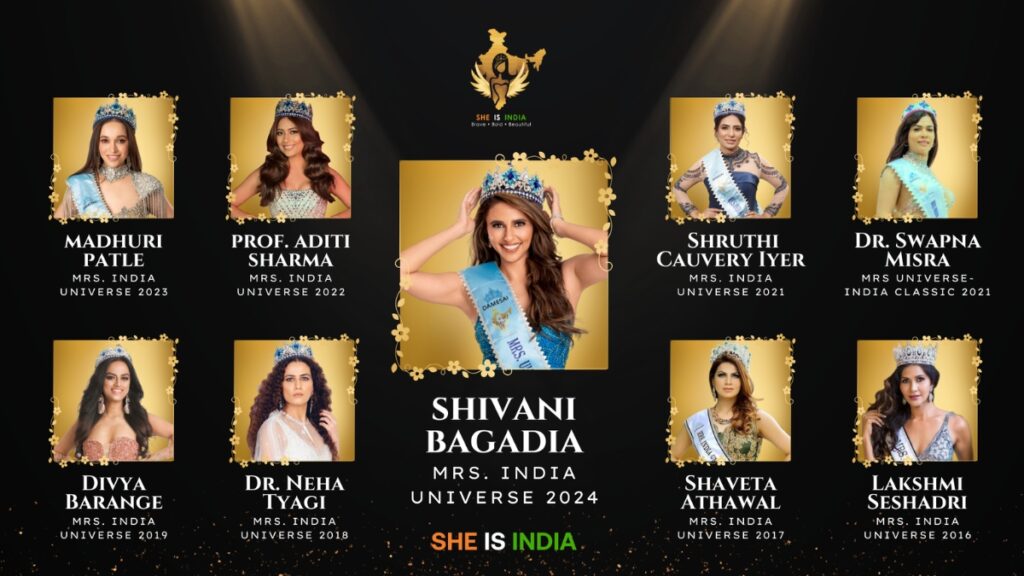 With her captivating presence and unwavering commitment to social causes, Shivani Bagadia, as the winner of the 9th edition of She is India, embodies the essence of what it means to be an empowered woman today—strong, confident, and unstoppable. Shivani Bagadia, Mrs India She is India- Mrs Universe India 2024 proudly donnes the mantle that her predecessor Mrs India She is India- Mrs Universe India have handed down, namely, Lakshmi Sheshadri (2016), Shaveta Athwal (2017), Dr. Neha Tyagi (2018), Divya Berang (2019), Shruti Cauveri Iyer (2021), Aditi Sharma (2022) and Madhuri Patle (2023).